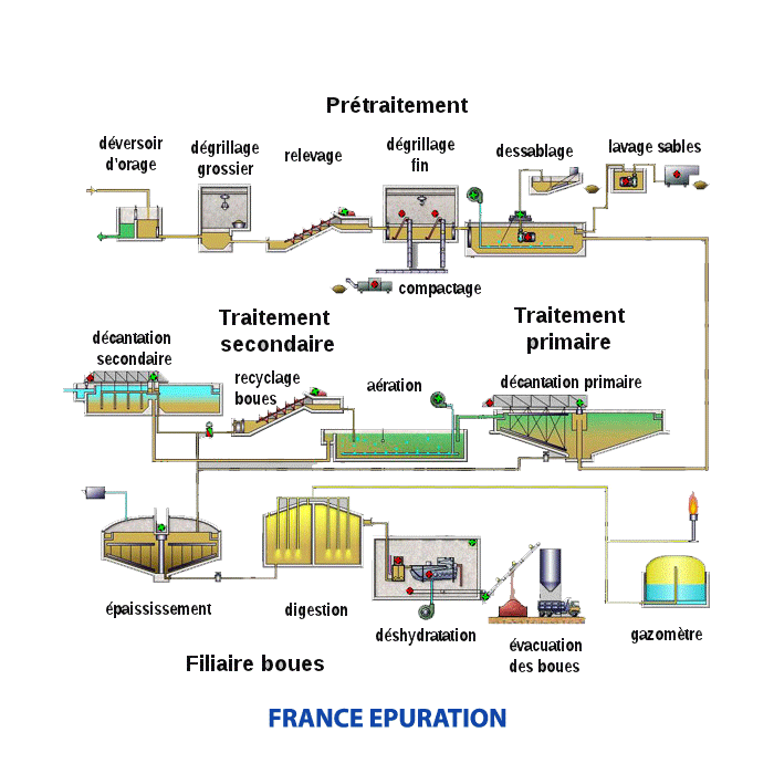 La définition d’une station d’épuration est en fait une séquence d’opérations qui permettent, petit à petit, de transformer les boues et les eaux usées en eau purifiée.